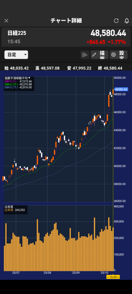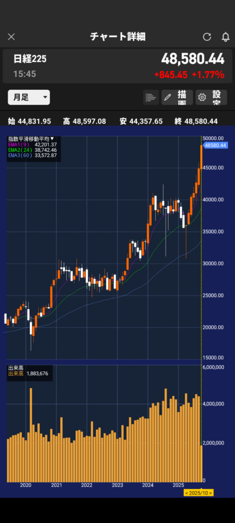 - 10月1日安値:44,357.65円 → わずか7営業日で約4,200円(+9.5%)上昇
