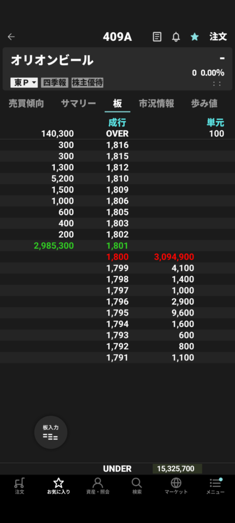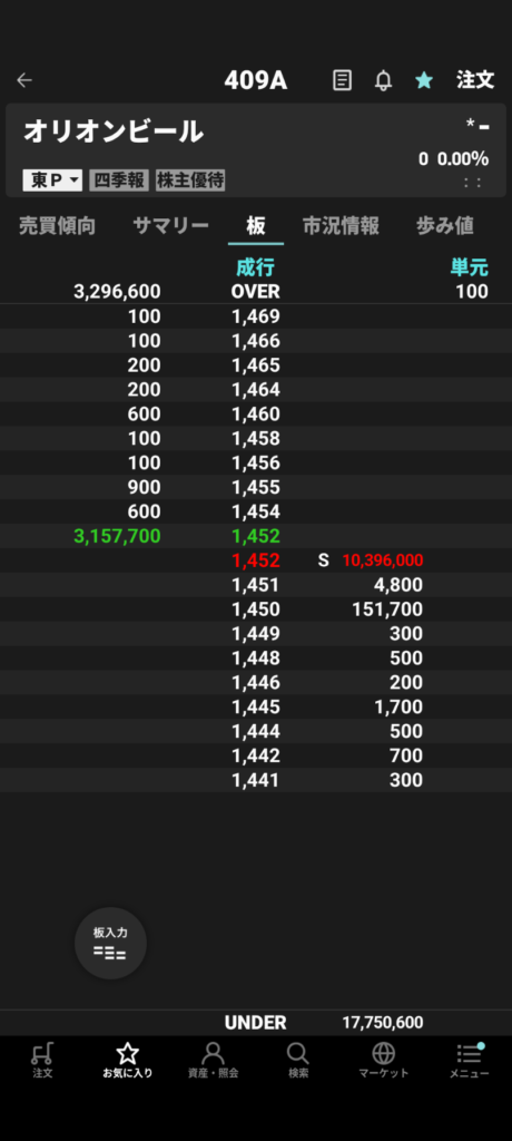 • End of morning session: ¥1,452; Bid vol: 10,396,000; Ask vol: 3,157,700 — nearly the size of the total offering turning over in the first half. (Rakuten app order book screenshot here — same disclaimer as above.)
