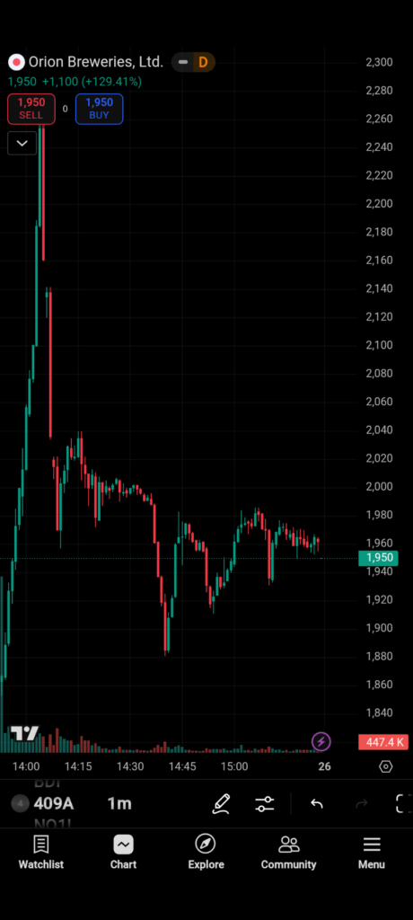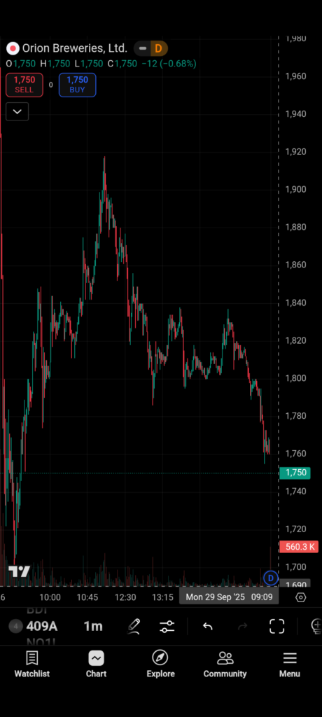 • With a soft broader tape, the stock opened flat to Day 1 close, quickly tagged ¥1,965, then slid to ¥1,701 by ~09:15 (≈–13.4% from the intraday high), effectively a near open-high to low washout.
